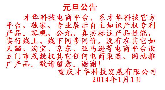 三、才华科技电商平台,系才华科技官方平台,独家、专业展示自主知识产权专利产品。客观、公允、真实标注产品性能,实行线上、线下同步同价。没有在其它如天猫、淘宝、京东、亚马逊等电商平台设立门市或授权其它任何电商渠道推广产品。